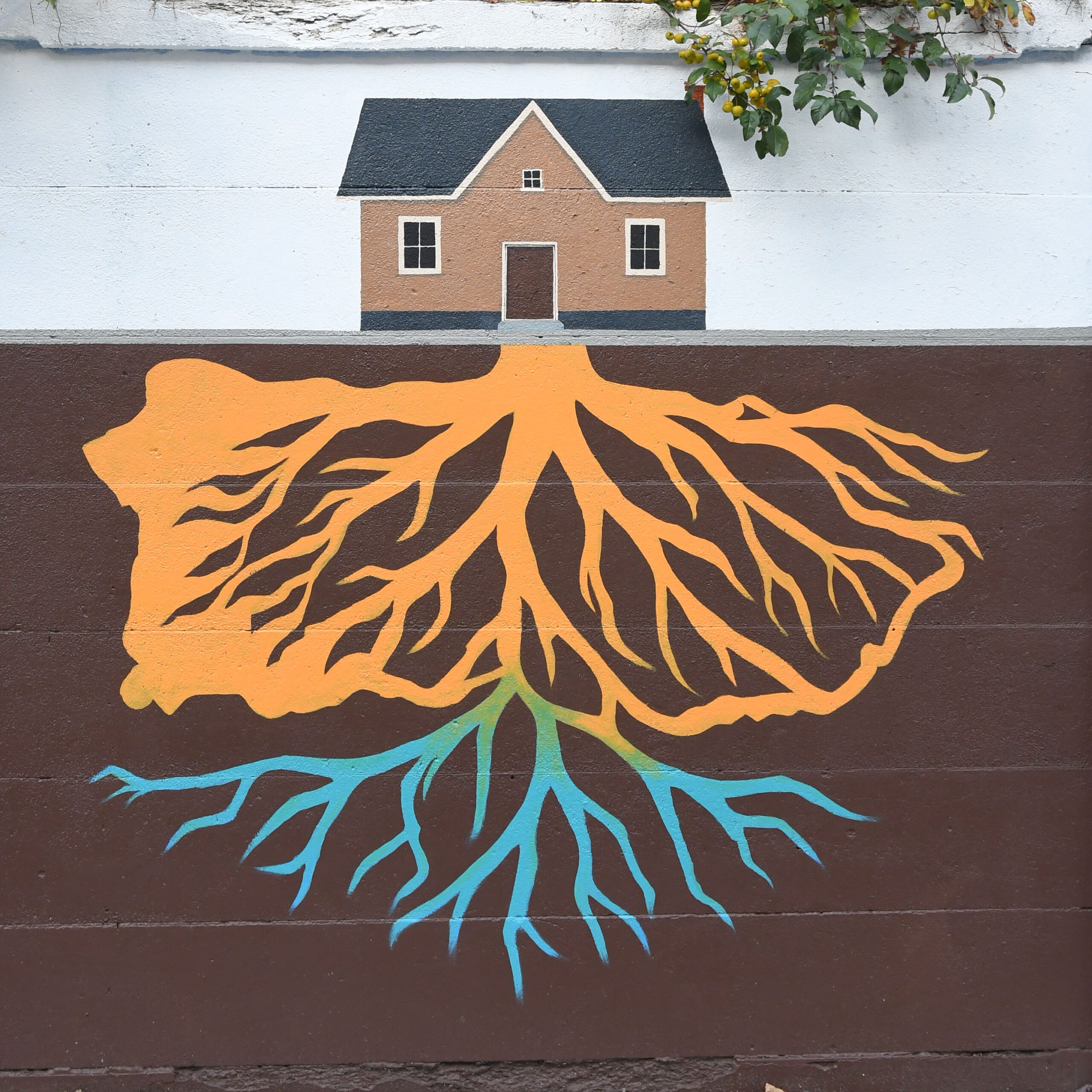 La Tierra Que Compartimos This mural reflects my journey growing up in Salem while rooted in my Puerto Rican heritage. The house above ground mirrors Salem’s neighborhood architecture, symbolizing the life, stability, and community we build in new places. Beneath the sidewalk, roots form the outline of Puerto Rico, reminding us that even far from the island, our culture, traditions, and memories remain alive. These roots carry my family’s stories, music, language, recipes, and values of resilience. The design represents migration: creating a new home without losing the essence of where we come from. Just as roots adapt to new soil, we adapt while carrying heritage within us. This mural also honors Salem’s immigrant and diaspora communities, especially in The Point, where cultures blend yet stay strong. It invites viewers to reflect on their own roots, what grounds and nourishes them, and how those roots continue to shape their lives wherever they grow.