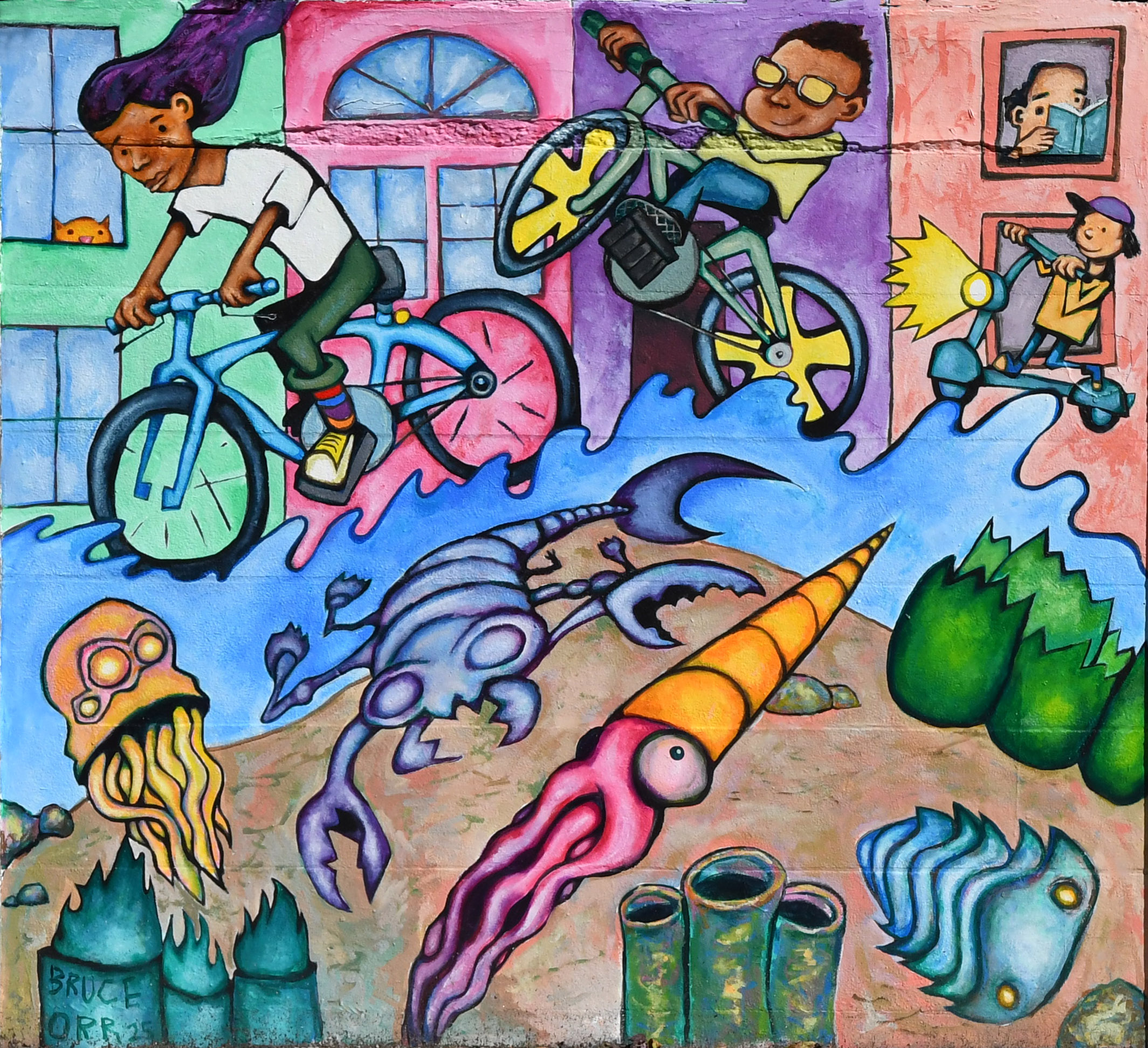 My roots are in Delaware City, Delaware, a small town sandwiched between an oil refinery and the Delaware River. My father is a prominent archaeologist, and I have vivid memories of digging up fossils in the dikes of the canal next to our town. My mural proposal is about how I have this strong sense of history embedded in my brain, and how that affects me as an artist and teacher. Although not primarily based in Salem, I have taught there, as well as Peabody and Beverly. My connection to the past, through my father, made me more compassionate and a more informed artist on the North Shore. My intention is that personal connection is illustrated in my proposal, in my lifelong journey from Philadelphia, to Portland, Oregon and landing in Beverly. Like an ancient trilobite, I feel my core being is here.