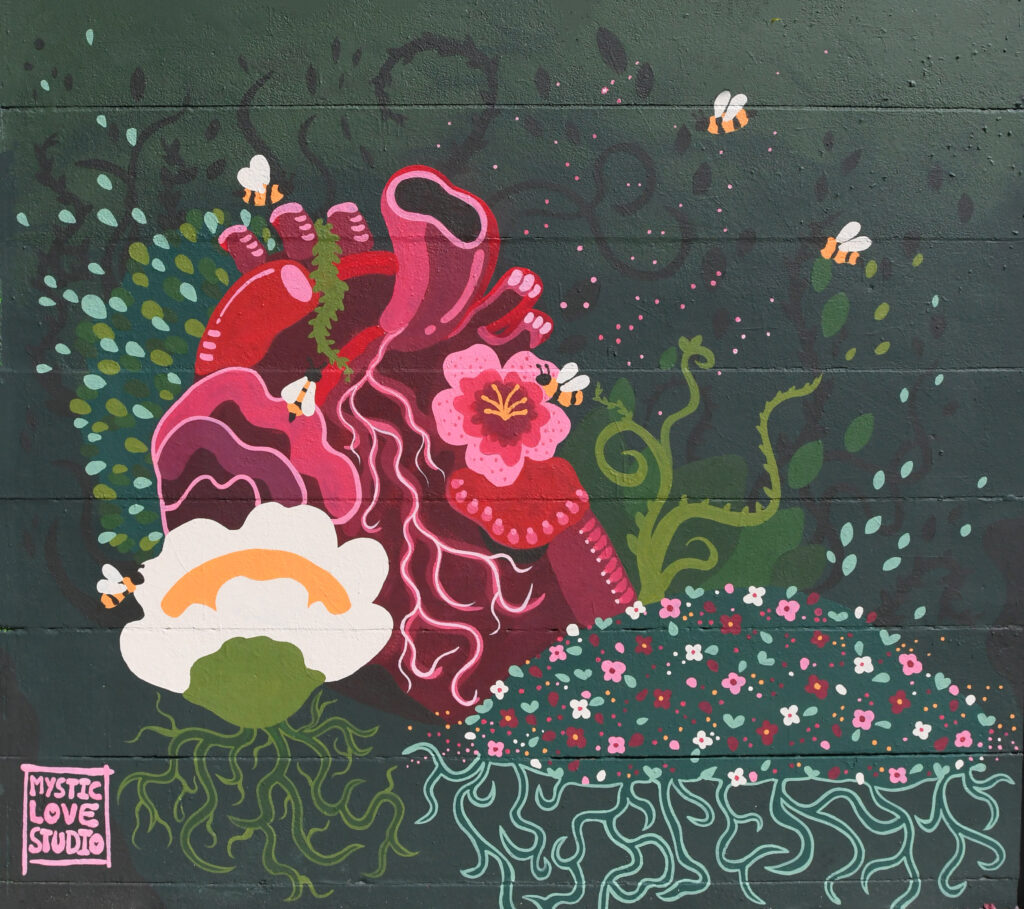 My work is deeply inspired by the natural world and shaped by the complexities of the human experience. We are bound together through trauma, compassion, and shared vulnerability. I explore how these cycles are reflected in our own personal and collective triumphs and struggles. These themes are integral to my work as I strive to create spaces that provoke empathy and encourage reflection. Pollination depicts an anatomical heart being pollinated into blooming roots, vines, and flowers. It speaks to the vital interconnectedness of all beings: how we must tend to each other like a forest shares nutrients across roots, without judgment of origin or expectation. We can create bloom. Through vibrant colors and intricate textures, I aim to evoke tenderness and urgency, My art is a call to recognize that true healing begins when we nurture the roots we share, and grow new ones through empathy, care, and collective hope.